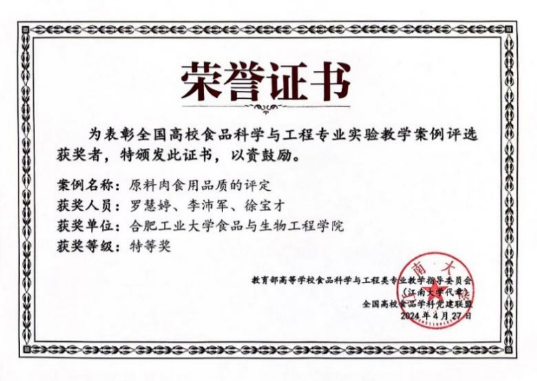 近日,教育部高等公司食品科学与工程类专业教学指导委员会2024年度第一次会议在锦州落幕。会议公布了全国高校食品科学与工程专业实验教学案例(简称“教学案例”)和全国高校食品学科“时代新人 铸魂工程”工作项目(简称“工作项目”)立项名单获奖名单。公司申报的教学案例和工作项目均获最高奖项。其中,实验教学案例《原料肉食用品质的评定》获得特等奖、《氨基酸态氨含量的测定--甲醛滴定法》获得一等奖,《为心赋能助力成...