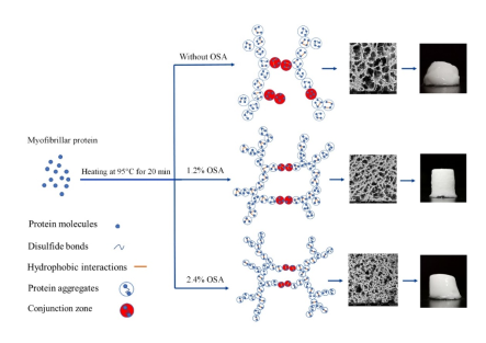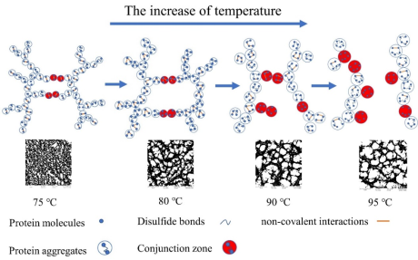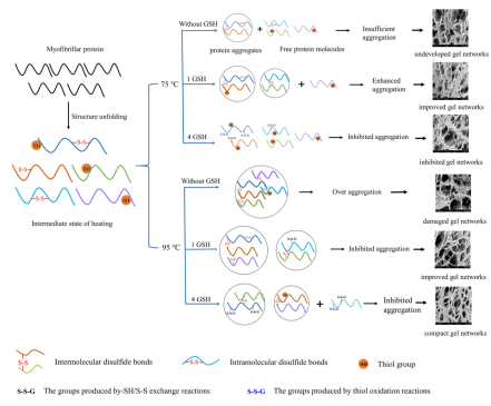 酱卤肉制品是深受我国消费者喜爱的传统特色肉制品,现代化生产中常采用高温灭菌达到延长货架期的目的。但是高温容易导致产品出水出油严重、肉质软烂、特征性风味劣变、营养损失,这已成为行业的共性难题。为了解决这一行业瓶颈,徐宝才研究员课题组首先基于肉蛋白凝胶在不同温度下微观结构和分子间作用力的变化,阐明了肉品在高温下发生质构劣变的机理(Insight into the mechanism of textural deterioration of myofibrillar protein gels at high temperature conditions, Food Chemistry 2020, 127186)。在质构劣变机理阐明的基础上,课题组以控制蛋白质分子热聚集为切入点,通过调控肉品蛋白质分子间的疏水相互作用(Modulating the aggregation of myofibrillar protein to alleviate the textural deterioration of protein gels at high temperature: The effect of hydrophobic interactions, Food Chemistry 2021, 128274)和二硫键(Glutathione-mediated formation of disulfide bonds modulates the properties of myofibrillar protein gels at different temperatures, Food Chemistry 2021)等相互作用力提升肉品在高温处理下的性能,为肉制品在高温杀菌过程中的质构劣变的解决提供理论基础和解决方案。