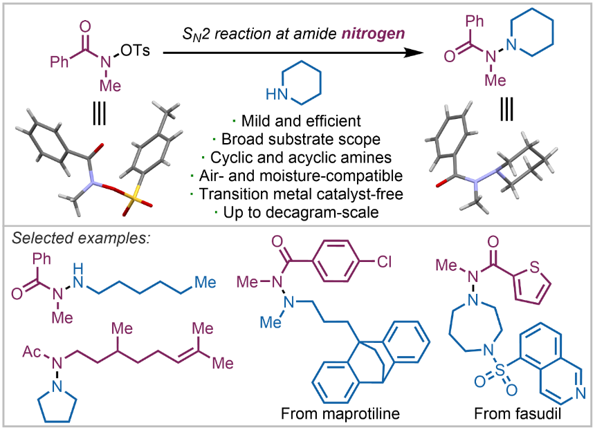 针对上述问题,作者提出了一种使用脂肪胺作为亲核试剂在酰胺氮原子上进行SN2反应的N−N成键方法,该方法为酰肼衍生物的合成提供了一种新的策略。这种新的N−N偶联方法,使用易于合成的O-对甲苯磺酰异羟肟酸酯和商业可得的一级、二级胺以及多种胺类上市药物反应,实现复杂酰肼结构的快速合成。该反应具有条件温和、不使用过渡金属催化剂、底物范围广、官能团兼容性好和可放大等特点。通过动力学、取代基电子效应等实验研究,作者证实了该反应经过SN2历程。此外,自由基捕获实验排除了该反应是自由基过程的可能性,计算化学研究结果也与上述实验结果匹配。总之,本研究成功实现了基于酰胺氮上SN2反应的酰肼合成。该反应不仅丰富了酰肼类分子的合成方法,还可能对酰胺氮原子上SN2反应的进一步研究有所启发。