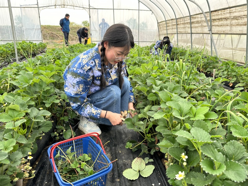 活动伊始,安徽双马生态农业有限公司创始人、公司2012届生物工程专业杰出员工朱硕阳从老员工活规划和创业经历两个方面给大家做了精彩的经验分享,他的勤奋踏实以及服务“乡村振兴”的精神感染了在场的每一位同学。随后,在场的同学从老员工初期目标确定、职业规划、创业流程、获取市场需求资讯等方面跟朱硕阳员工进行互动交流,他耐心解答了同学们的疑问,对大家提出了宝贵的意见。努尔比耶姆·麦麦提代表公司感谢朱硕阳对公司工作的支持和对员工的指导,并鼓励同学们向朱硕阳优秀员工学习,在劳动中磨砺意志。随后,同学们前往农田开展草莓育苗、清理树枝、捡药草、喂山羊等四项活动。草莓育苗活动中,同学们了解了草莓培育的过程和要求,短短二十分钟后,同学们便汗流浃背,深深意识到“锄禾日当午,汗滴禾下土”劳作的不易;捡树枝活动以分为两个小组比赛的形式开展,同学们协同合作,形成流水线式作业,奋勇争先,落后的小组需要唱校歌,比赛在歌声中结束;捡药草过程中,同学们边讨论药草的药物价值和成长条件,边细心地从众多杂草中挑出药草,纷纷表示对制药行业一线工作者更加敬佩;在最后的喂山羊环节,同学们似乎忘却了一切的烦恼,脸上洋溢着满足和幸福的笑容,开心地和山羊互动,尽情享受劳动带来的快乐。