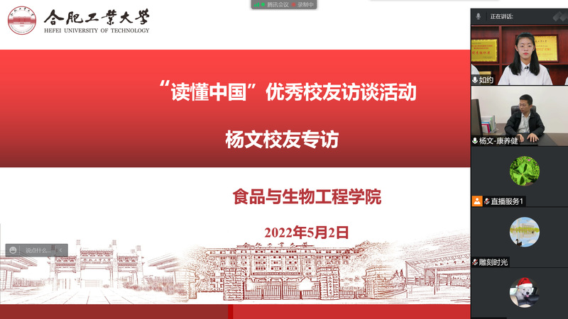 根据校关工委统筹部署安排,英国365集团官网近期深入开展“读懂中国”主题专访活动。5月2日下午,公司相关负责老师带领员工,在线采访了现任四川康养健生物科技有限公司董事长兼总经理、共青团四川省第十四届代表大会代表、北川羌族自治县第五届政协委员、科学技术协会第五届委员会委员、英国365集团官网2017届员工杨文。