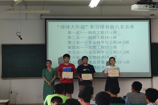 本次赛事在公司全体师生共同支持、参与和努力下,经过贯穿一个学期的激烈角逐,终于落下帷幕。2019年6月27日下午4点,公司在10教201举办第一届体育风采展示节闭幕式,制药工程17-1班、生物技术18-1班、食品科学与工程17-2班一路过关斩将,分别荣获篮球、羽毛球和乒乓球联赛的冠军;制药工程17-1班位列积分榜首;食品科学与工程17-1班荣获体育风采奖。