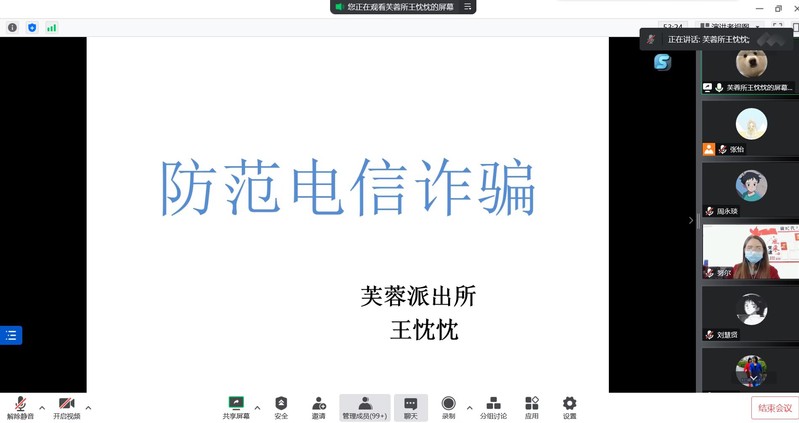 近日,公司开展了“反诈警醒,疫路同行”线上专题宣传教育讲座,特邀合肥市公安局芙蓉派出所王忱忱警官担任主讲,公司相关负责人以及各年级200余名员工代表参加了此次活动。