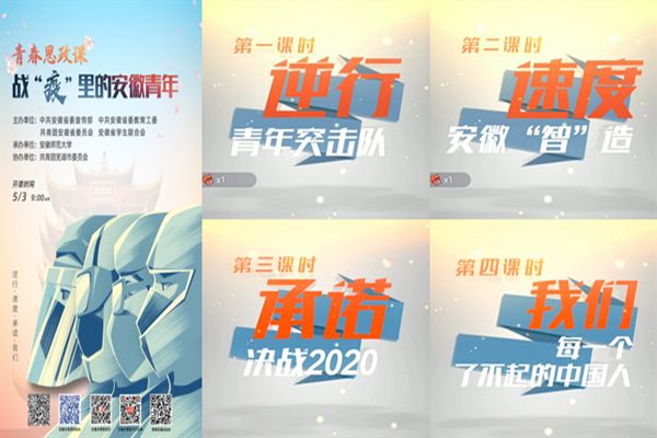 本次青春思政课共分为“逆行”、“速度”、“承诺”和“我们”四个课时,各条战线上的战疫青年代表也被邀请到直播间讲述他们作为安徽青年的战疫故事。在第一课时“逆行”中,安徽省援鄂医护人员王昌会等人在现场向大家讲述了所在团队克服困难、精诚团结、不惧危险、冲锋在前的逆行故事。在第二课时“速度“中,三位技术研发工作人员讲述了安徽“智”造如何成为战胜疫情的“加速器”。在接下来的课时“承诺”中,直播现场请来了在脱贫攻坚一线的两位党支书向我们分享他们生产防疫两手抓的青春扶贫故事,并展示、宣传了当地农产品。