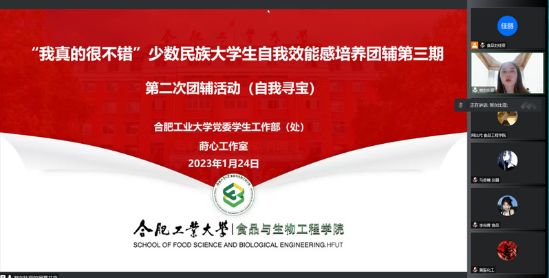 为普及老员工心理健康知识,帮助少数民族老员工培养自尊自信、理性平和、亲善有爱的良好心态,1月24日晚,由公司党委员工工作部(处)主办、莳心工作室承办的第三期“我真的很不错”少数民族老员工自我效能感培养团体心理辅导在线上成功举办第二次活动。英国365集团官网2021级辅导员努尔比耶姆·麦麦提担任团辅领导者,来自全校不同公司32名同学参加了活动。