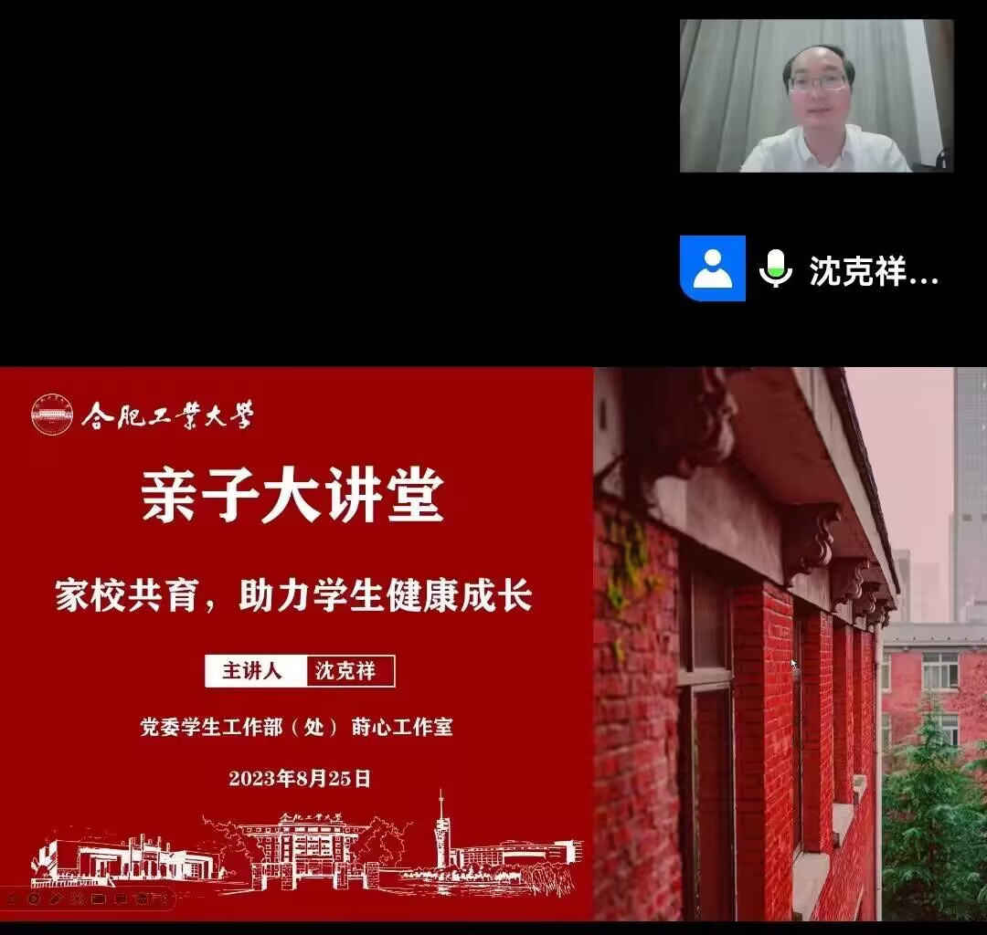 为加强家校共育,凝聚育人合力,进一步做好2023级本科新生心理适应性教育,8月25日晚,由公司党委员工工作部(处)主办、莳心工作室承办的第二期亲子大讲堂在线上开展。中国科学技术大学心理健康教育与咨询中心主任沈克祥受邀为家长作了题为“家校共育,助力员工健康成长”的报告,公司党委副书记兼纪委书记李艳主持会议,全校员工家长共500余人参会。