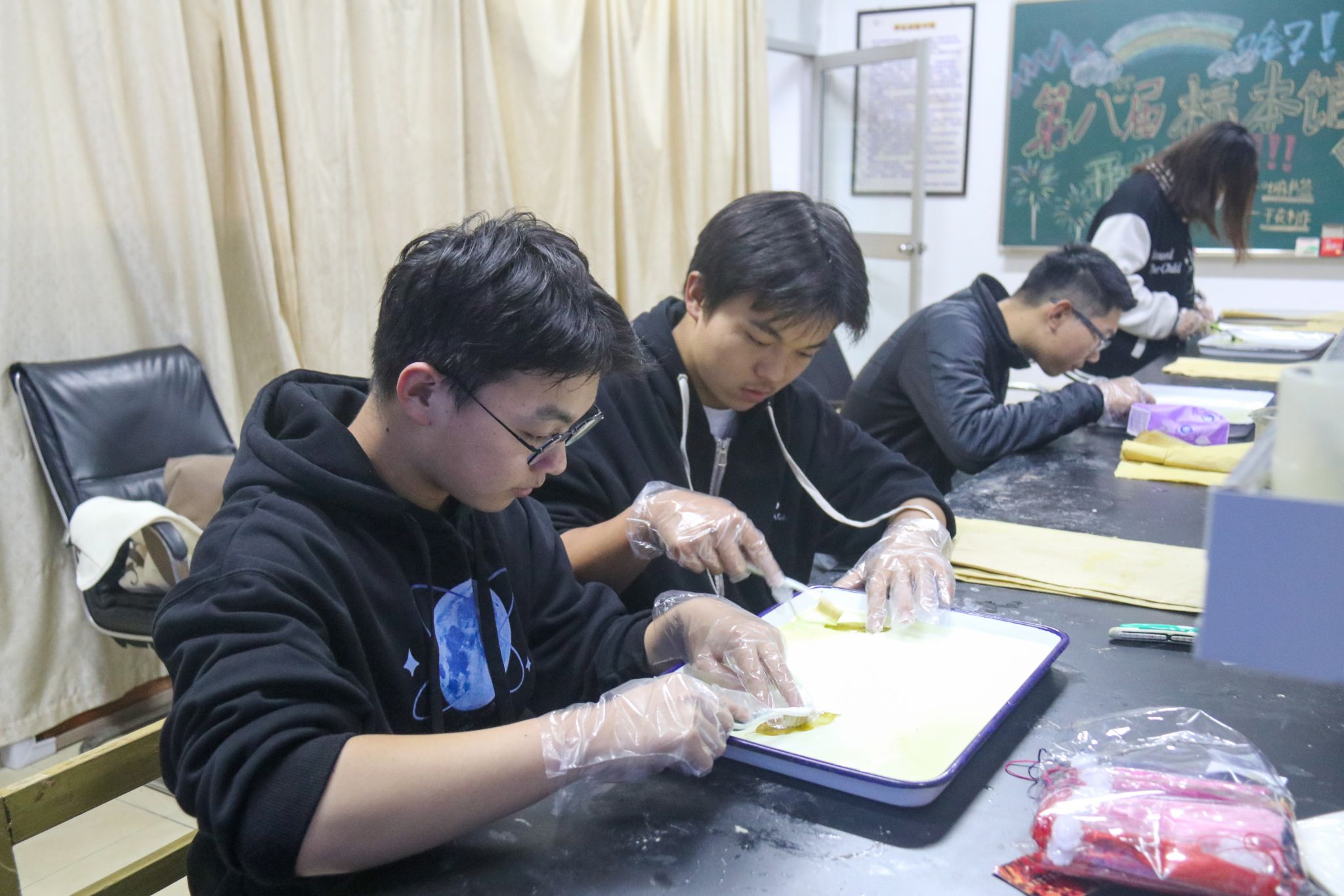 活动举办前,公司在翡翠湖校区第一、第三食堂门前广场进行了线下宣传,现场摆放的生物标本引起广大同学的浓厚兴趣和广泛关注。生物标本馆位于翡翠湖校区一食堂楼下,分为“生物标本科普展厅”和“叶脉书签制作体验厅”。参观中,讲解员耐心细致地为前来参观的同学们科普了生命标本制作的相关理论知识,详细介绍了馆类所展示的动物、植物以及创意标本的收藏情况以及生命标本制作过程背后的故事。一件件保存完好的生物标本,以及由标本照片制成的趣味拼图,使同学们在乐趣中对生命科学有了更深的了解。在叶脉书签制作体验厅,同学们体验了用树叶制作工艺品的方法,锻炼了动手能力。