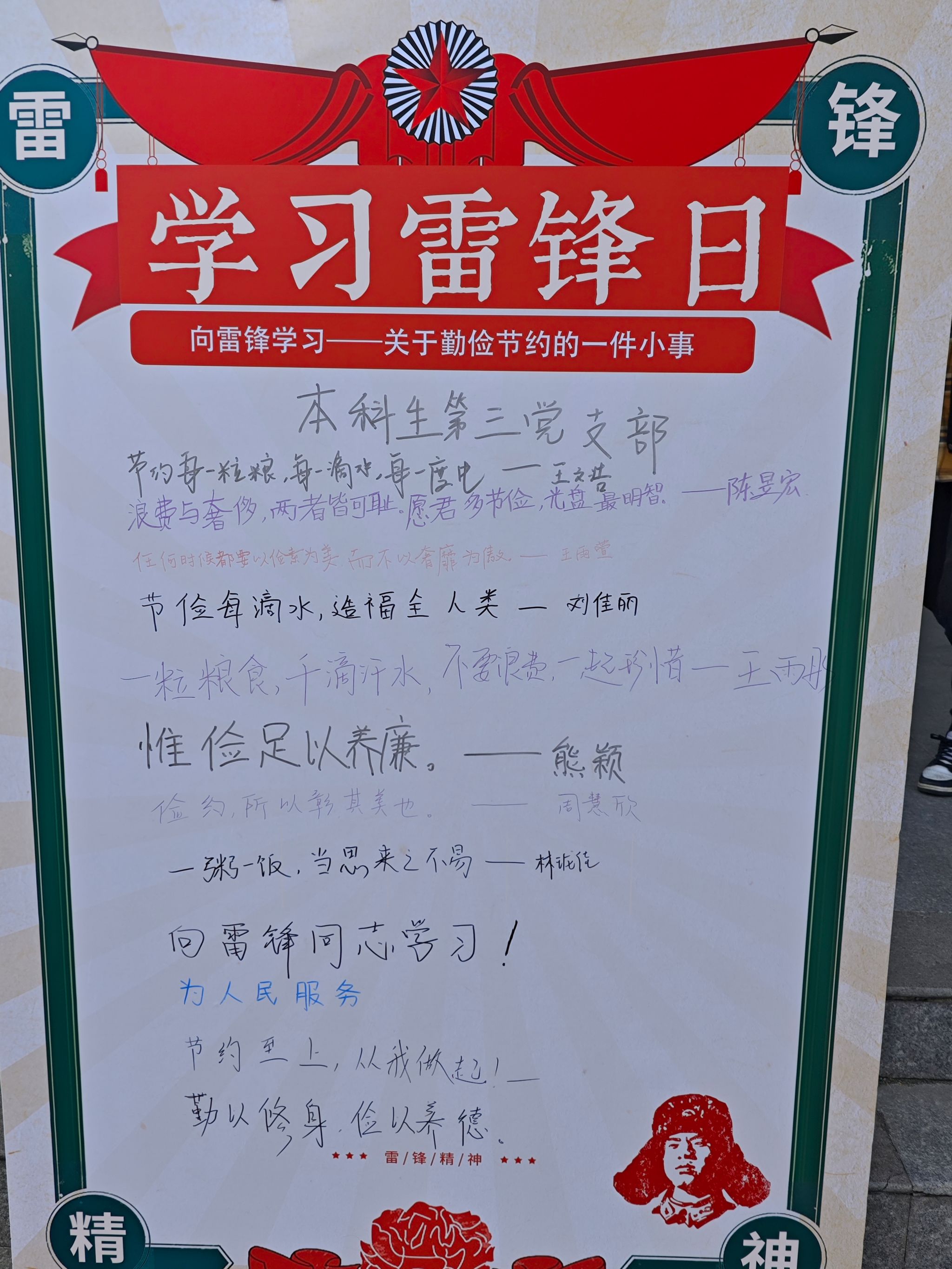 为进一步贯彻落实习近平总书记关于开展学雷锋活动的重要指示,推动校园文明建设,近日,公司举办“青春向党,五育共融”党建品牌之“砥砺奋进三十载,学习雷锋践初心”系列主题教育活动,活动由本科生第三党支部承办。这些活动包括整理单车、“光盘行动”打卡以及文明餐桌签字等,旨在引导广大党员和青年自觉养成勤俭节约、珍惜粮食的绿色低碳生活习惯,培育崇尚节约的校园文化,弘扬中华传统美德。