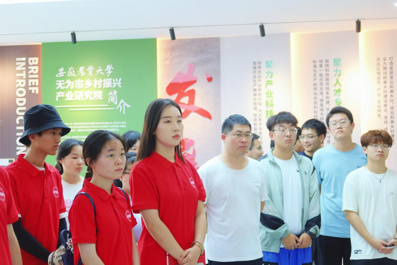 结束简单的实地调研后,实践团队来到了安徽农业大学无为市乡村振兴产业研究院。在研究院工作人员的带领下,参观了研究院展厅以及实验室,更加深入了解了无为市乡村振兴产业产品。与此同时,由安徽农业大学金生振博士带领的水产养殖学(定向培养班)2023级实习团队也来到研究院进行培训学习,两校学子进行了友好交流和相互学习,此次共同研学不仅加深了两校之间的友谊,更为乡村振兴注入了新的活力与思路。