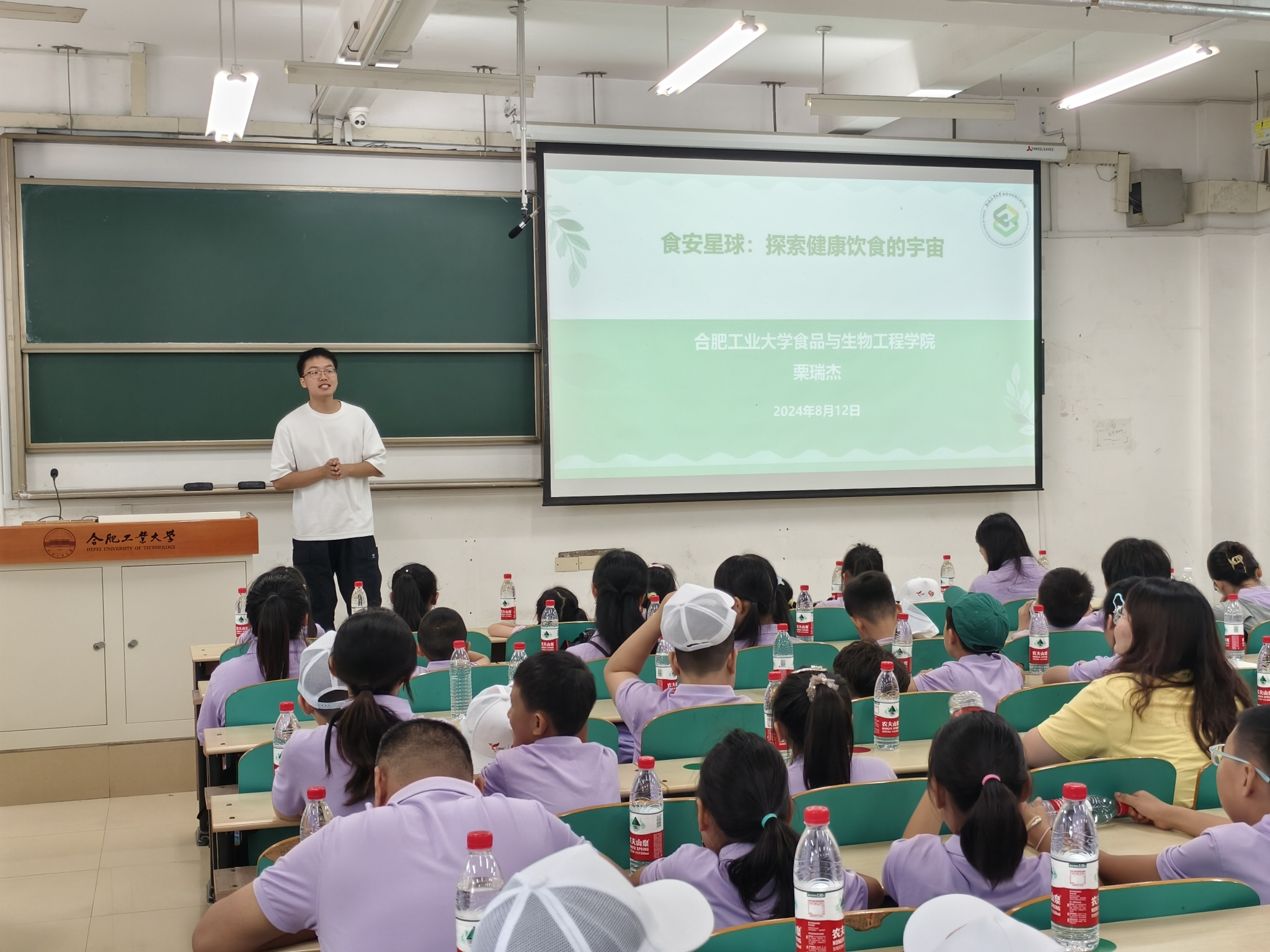 活动伊始,小朋友们在志愿者与工作人员的带领下来到翠5教203,进行“食安星球:探索健康饮食的宇宙”食品安全小知识课堂,英国365集团官网2024级辅导员栗瑞杰,通过理论概述、实践操作与问答互动,激发小朋友们对食品健康安全的兴趣。授课结束后,工作人员为参与研学的小朋友们颁发“食品安全小卫士”证书。
