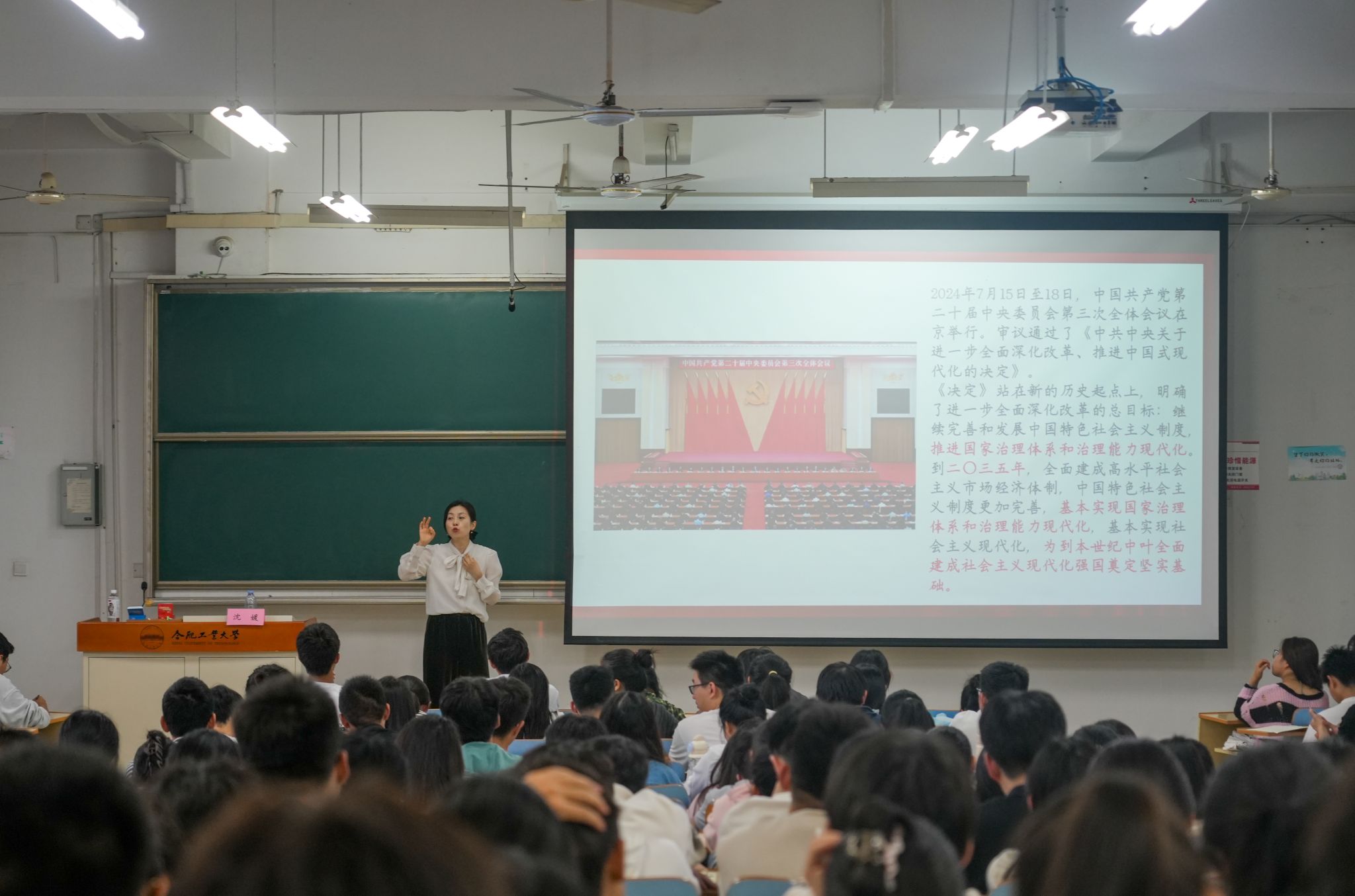 开班典礼结束后,安徽省团校副教授、团中央“青年讲师团”成员沈媛老师,为学员带来第一堂课:《学习贯彻党的二十届三中全会精神 奋力书写为中国式现代化挺膺担当青春篇章》。沈媛老师全面系统地解读了党的二十届三中全会的重大精神、丰富内涵和精神实质,主要介绍了“进一步全面深化改革的总目标”“推进中国式现代化的七个聚焦”“全面深化改革的六个原则”“全面深化改革做出的系统部署”等内容,让同学们深刻认识到党的二十届三中全会精神与我们的生活息息相关,与国家的未来紧密相连。沈媛勉励同学们增强政治责任感和历史使命感,永葆初心本色、坚定理想信念、筑牢信仰之基、练就过硬本领、敢于担当作为,做全会精神的学习者和实践者,在推进强国建设、民族复兴伟业中展现青春作为、彰显青春风采、贡献青春力量、书写青春华章!