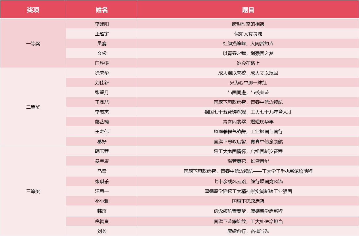 此次征文比赛采用线上投稿方式,面向全院征集文稿,征文内容涵盖了新中国成立以来在政治、经济、文化等各个领域取得的伟大成就,以及师生们在新时代背景下对个人成长和社会责任的思考,主题鲜明且富有意义,吸引了众多员工踊跃参与。参赛同学纷纷用文字抒发对祖国的热爱与祝福,展示了青年学子的赤诚火热的爱国心。经过评委的精心评选,根据作品的思想性、文字水平等多方面标准,最终评选出一等奖5名、二等奖8名、三等奖9名,并予以表彰。