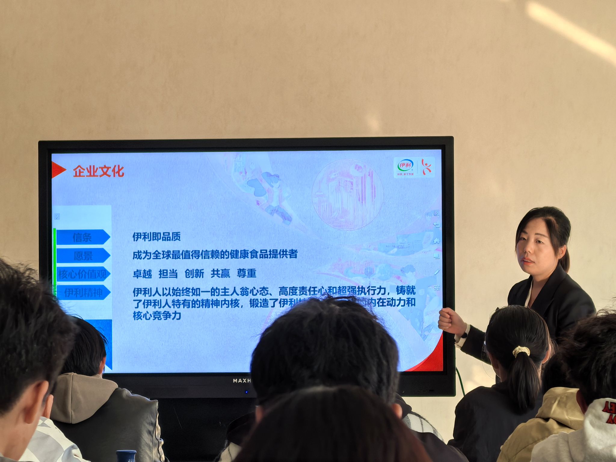 随后的座谈会上,合肥伊利HRBP经理杨彩娟对公司师生一行表示热烈欢迎,对公司人才培养、科学研究等给予高度评价,并为同学们介绍了公司企业文化、人才招聘和人才培养等基本情况。她寄语大家在大学期间尽早明确自我定位,清晰自我发展目标,结合自身素质与能力选择适合自己的职业路径,不断丰富自我、自我、突破自我、实现自我。此外,员工们还有机会与在一线工作的员工面对面交流,听取他们在职场中的奋斗故事和成长心得。同学们积极提问,踊跃发言,现场氛围热烈。