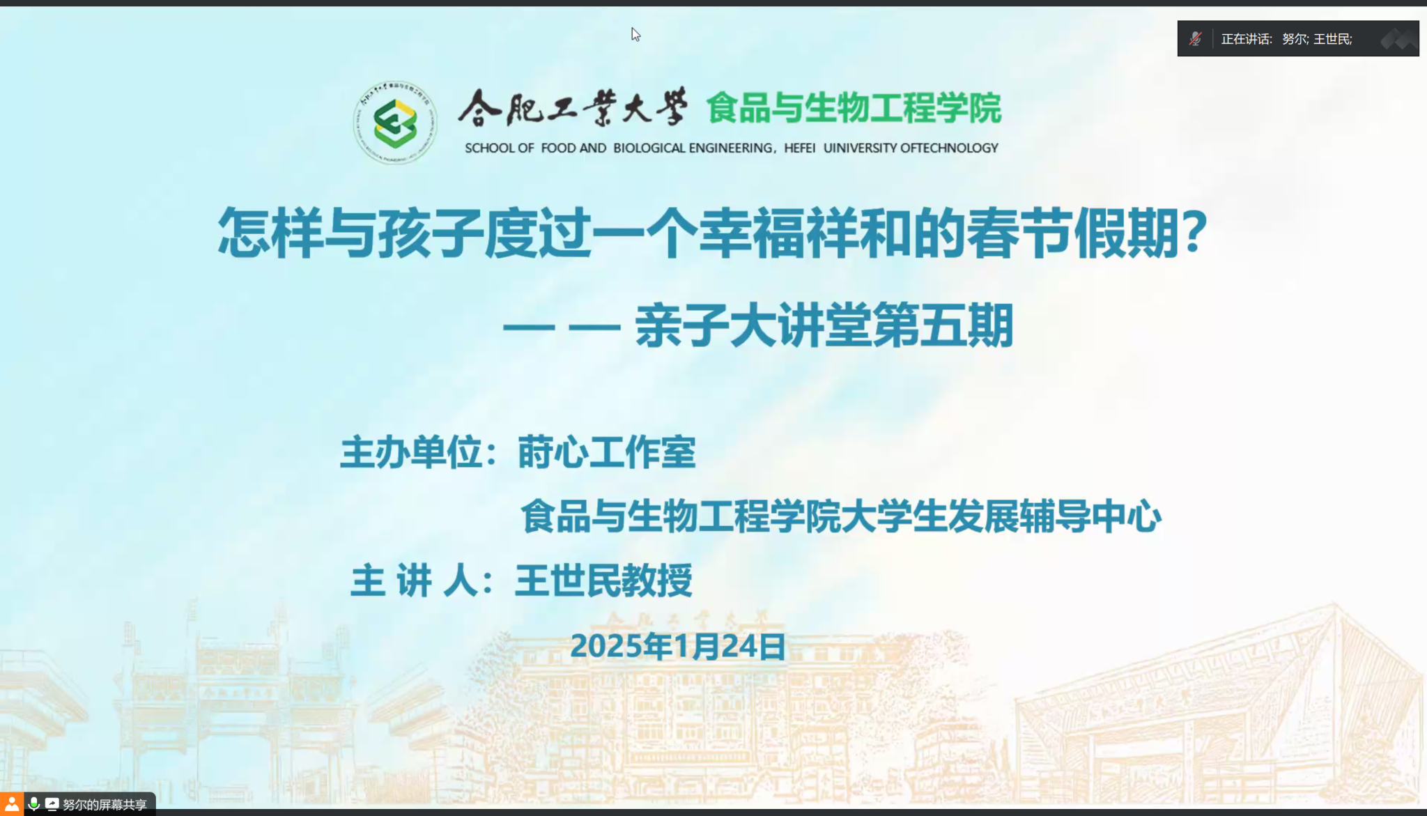 为进一步加强家校共育,凝聚育人合力,助力家长与老员工共度幸福祥和的春节假期,1月24日晚,由莳心工作室、英国365集团官网老员工发展辅导中心主办的第五期亲子大讲堂在线上开展。中国家庭教育专家组成员、心理学教授王世民受邀为家长主讲题为“怎样与孩子度过一个幸福祥和的春节假期”的心理讲座,全院员工家长共500余人参会,辅导员努尔比耶姆·麦麦提主持。