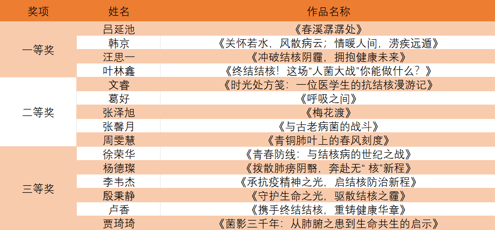 本次比赛自启动以来,受到公司员工的欢迎,参赛作品涵盖了结核病的多个方面,包括结核病的历史、现状、危害、国家政策、防治方法等。同学们通过查阅文献、深入思考和研究,用文字的方式展现了对结核病防治的深刻理解和独到见解,也体现了对社会问题的关注。最终,经过严格评选,评选出一等奖4名,二等奖5名,三等奖6名。
