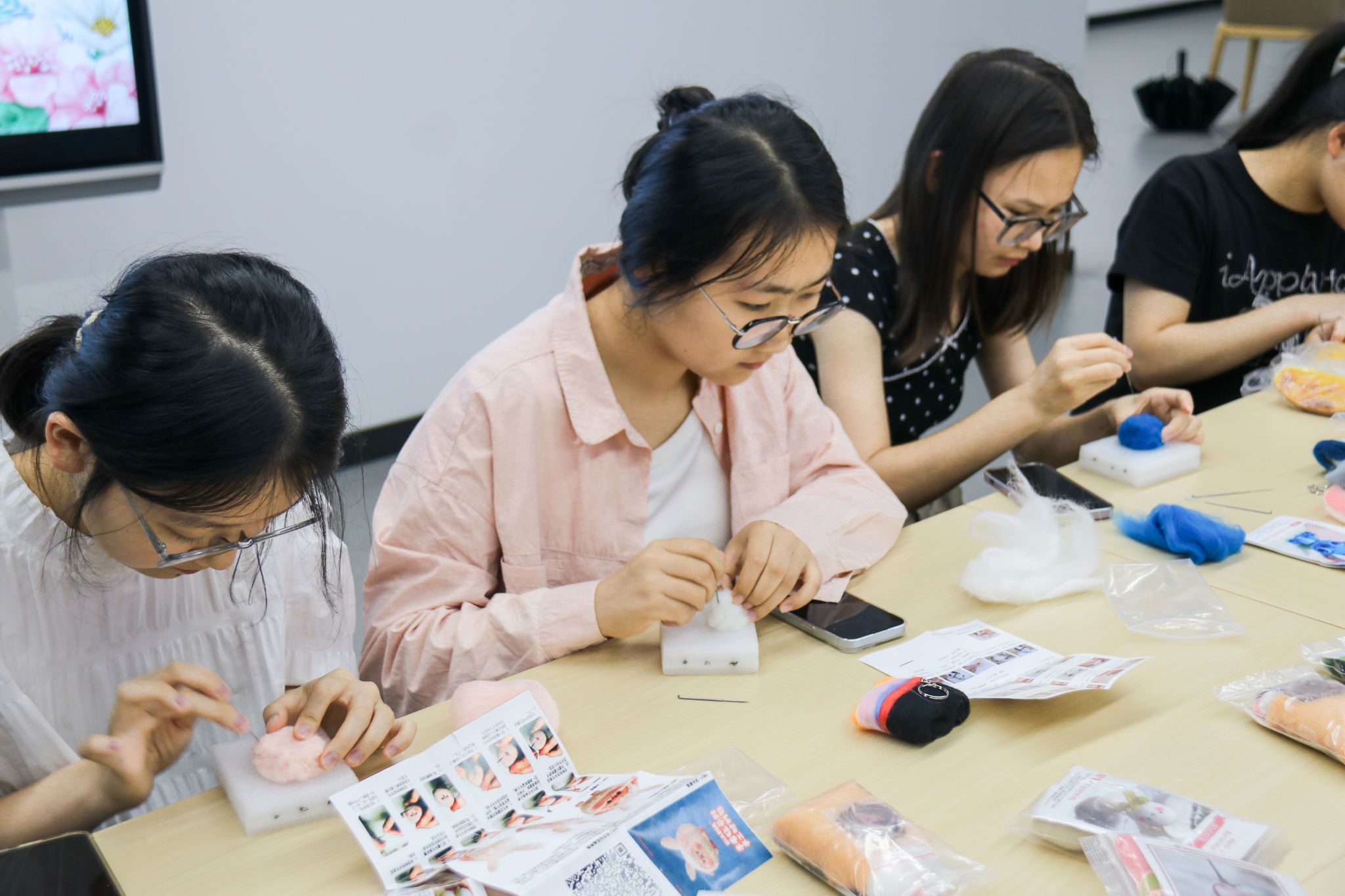 通过沉浸式手工体验,在创意与协作中释放压力,探索心灵成长新路径,活动围绕“艺术疗愈”理念设计,设置“解压羊毛毡戳戳乐”与“许愿纸卷胶囊”两个创意环节。在轻柔的背景音乐中,同学们手持彩色羊毛与戳针,专注制作憨态可掬的萌宠挂件或柔软解压球。“许愿纸卷胶囊”环节则充满诗意与仪式感。同学们在素色信笺上书写成长愿望、绘制个性涂鸦,将满载心事的纸卷封存于透明胶囊瓶中。