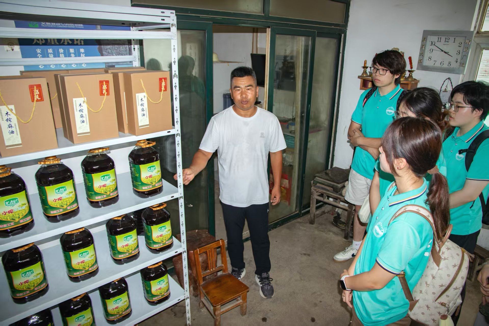 随后,团队转赴夏阁镇柳南村南塘油厂,浓郁的菜籽油香扑面而来。油厂负责人吴道明向学子们介绍了菜籽油的年产量、传统压榨工艺、油品的独特风味以及当前销售状况。团队重点调研了幸福路平台在助力市场开拓、提升流通效率方面的创新举措,清晰勾勒出平台在特色农产品产业链条中扮演的关键角色和取得的扎实成效。