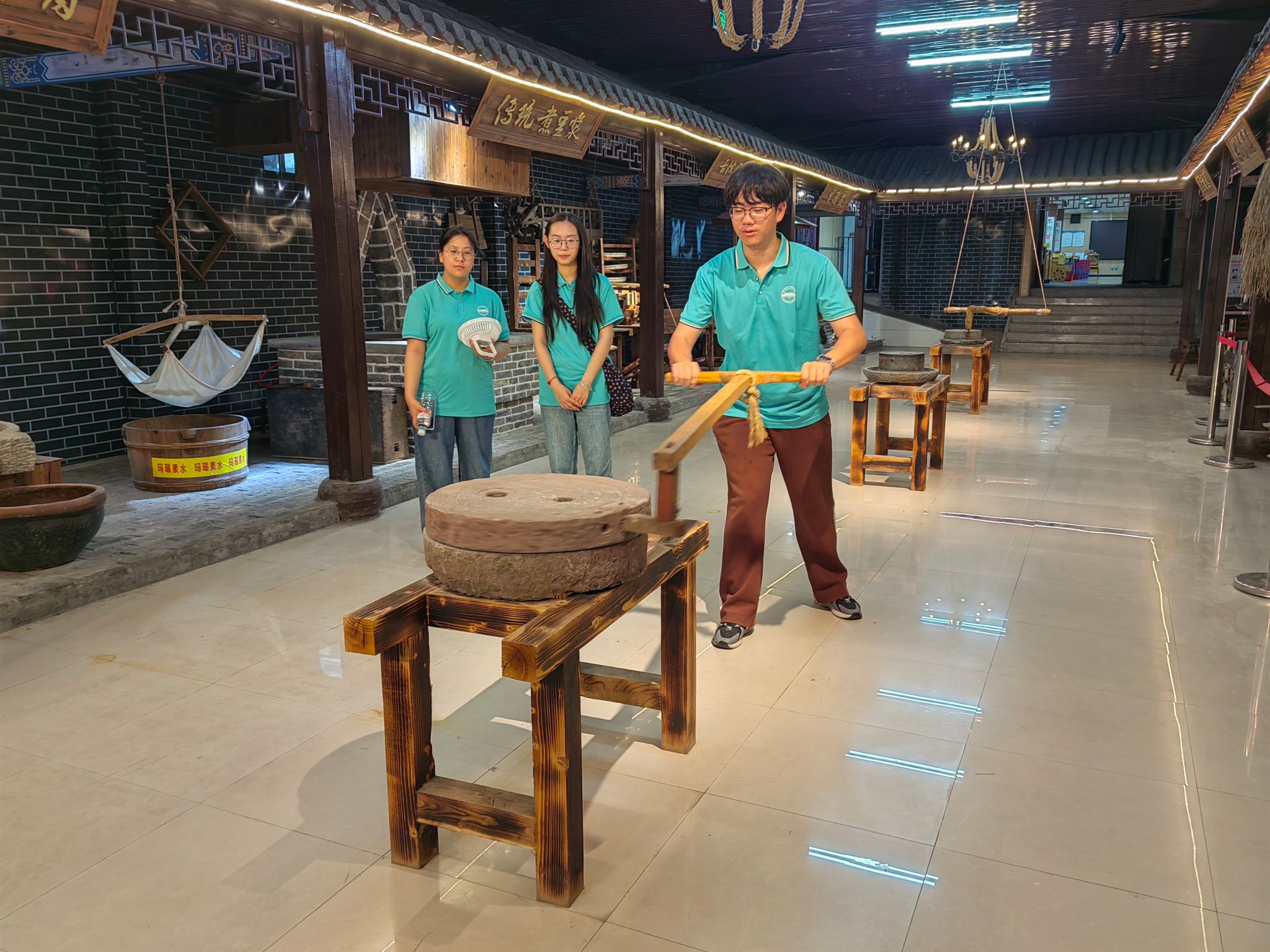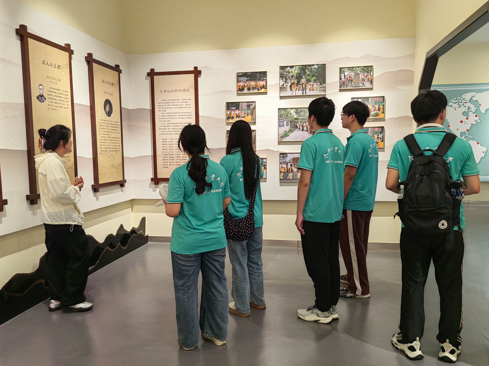7月9日上午,在八公山豆腐主题文化园,团队系统调研了豆腐制作技艺这一国家级非遗。从西汉淮南王刘安炼丹偶得豆腐的传说,到浸泡、磨浆、滤浆、煮浆、点卤等一系列传统工艺步骤,再到现代机械辅助研磨的应用,队员们见证了豆腐文化跨越千年的传承与演变。