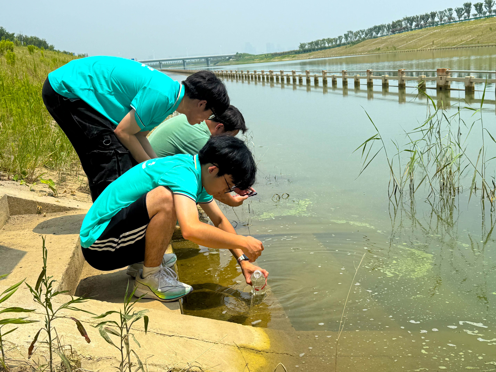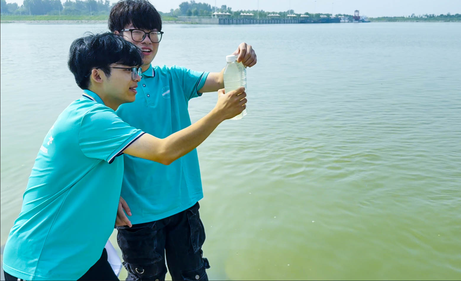 为科学分析藻类污染及其影响机制,在指导教师徐芳带领下,团队成员结合专业背景知识,在巢湖口进行了分区水质取样。这些样本将为后续实验室分析提供依据,有助于团队更精准地评估“引江济淮”工程在水质净化方面的实际效果。
