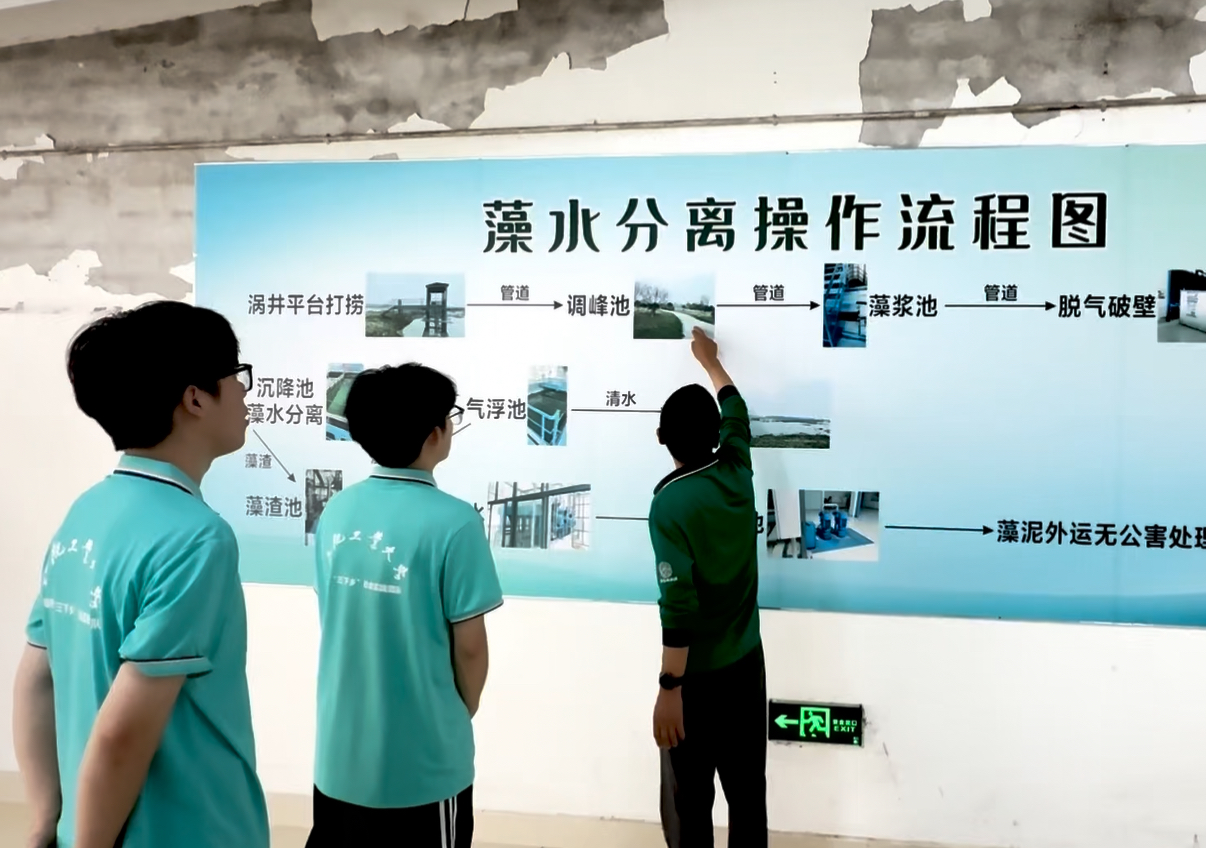 在派河巢湖口,实践团实地考察了包河区河口藻水分离站。工作人员热情接待了团队,详细解答了关于藻类污染治理技术与资源化利用途径的疑问,并系统介绍了分离站的工作原理及藻水分离操作流程。此次交流为团队深入了解巢湖蓝藻治理实践提供了宝贵的一手资料。
