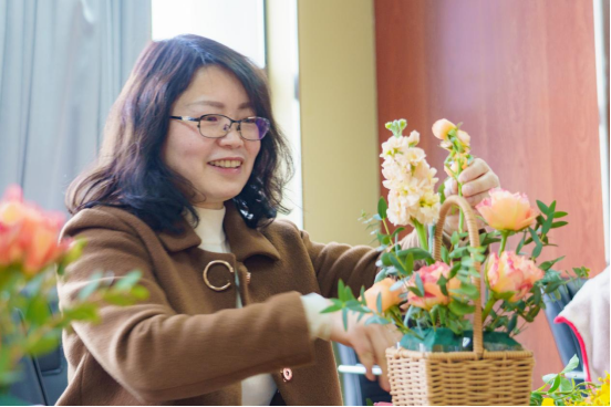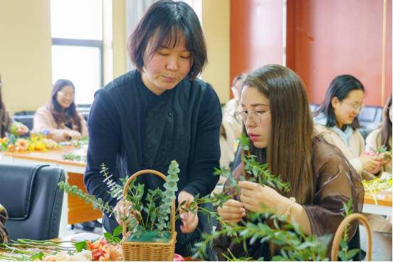 现场花香弥漫,笑声不断,女教职工们都将自己从忙碌的工作中短暂地脱离出来,全身放松地投入到自己的创作中。