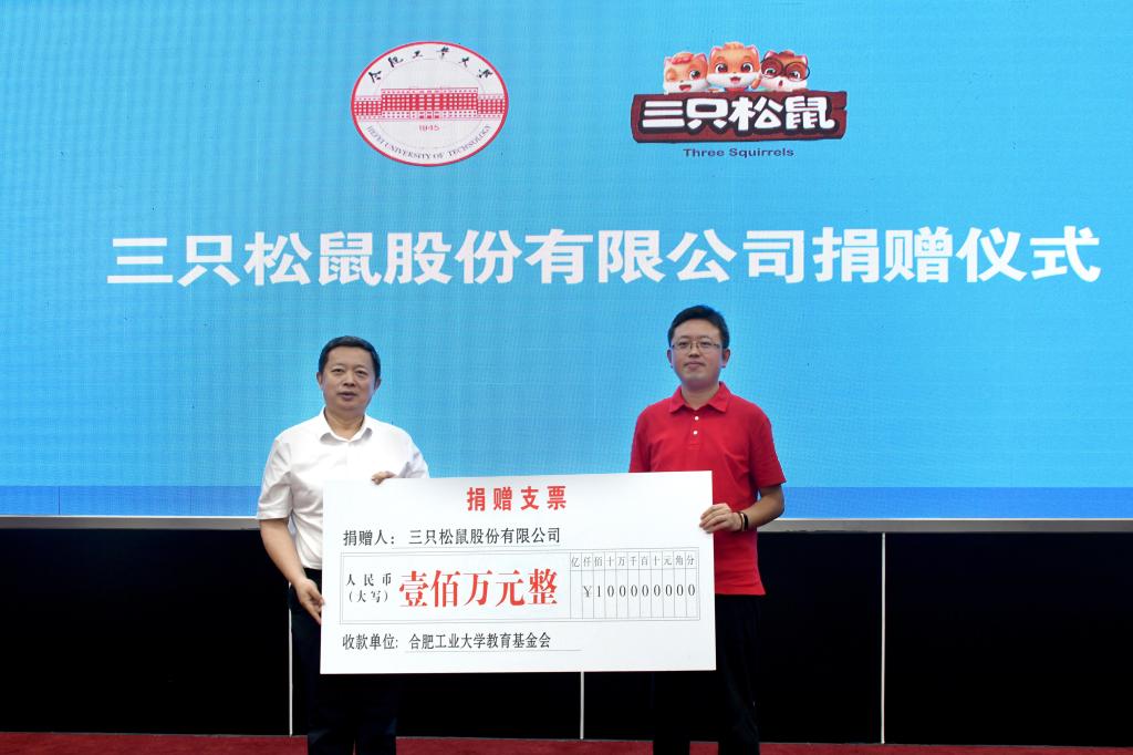 6月21日下午,三只松鼠股份有限公司捐赠仪式在翡翠湖校区举行。公司党委书记余其俊,公司党委副书记、员工总会常务副会长陈刚出席捐赠仪式。