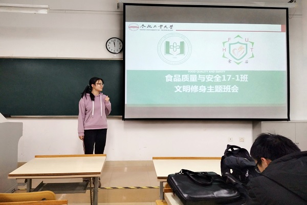 2018年12月17日晚七点,食品质量与安全17-1班于翠四教304召开“文明修身”主题班会。全体班级成员均到场,班会由团支书江倩主持。