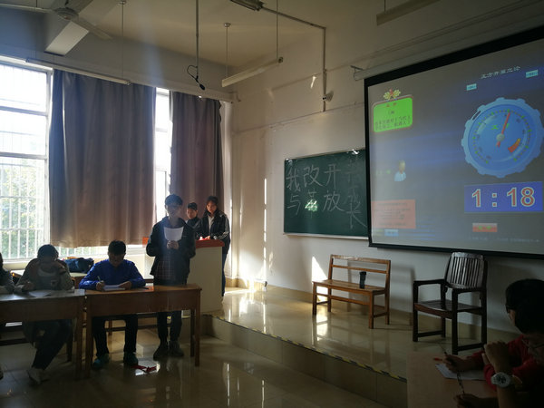 10月12日上午8:00-11:00,2017级药学1班于翡翠湖校区三教208举办了“我与改革开放共成长”室内学习活动,活动多板块进行。活动伊始,2017级辅导员张建国老师上台致辞,他讲述了自己童年时期的经历,与现代的生活形成鲜明的对比,张建国老师勉励青年一代在享受着物质极大丰富的同时,更应担起责任,珍惜韶华,努力拼搏,实现自身价值,为国家作出贡献。随后便是由2017级药学一班同学带来的“改革之春”小品表演,小品以一个小家庭中发生的一个小事件,映射改革开放对我国社会带来的影响;活动接着是以“改革开放对当代老员工而言,是机遇大于挑战,还是挑战大于机遇”为辩题的辩论赛,同学们通过激烈的唇枪舌战,在辩论中阐明改革开放给当代老员工带来不仅仅是前所未有的机遇,祖国也面临着新的形势和新的挑战,作为当代青年老员工应当勇担时代大任,为实现中华民族伟大复兴而不懈奋斗;活动然后,通过观看对公司辅导员及授课老师们的采访视频,从他们的角度去了解中国的改革开放;本次活动从“受益者”、“见证者”和“推动者”多角度地阐述了青年老员工与改革开放的关系。
