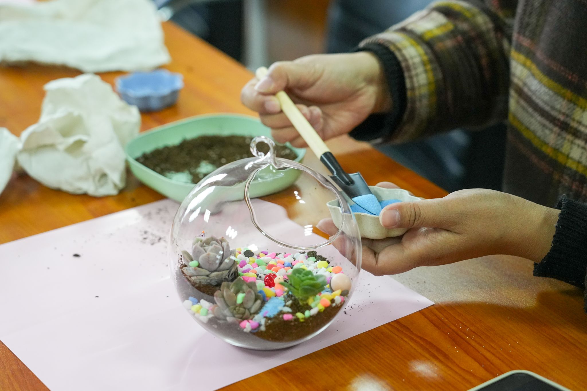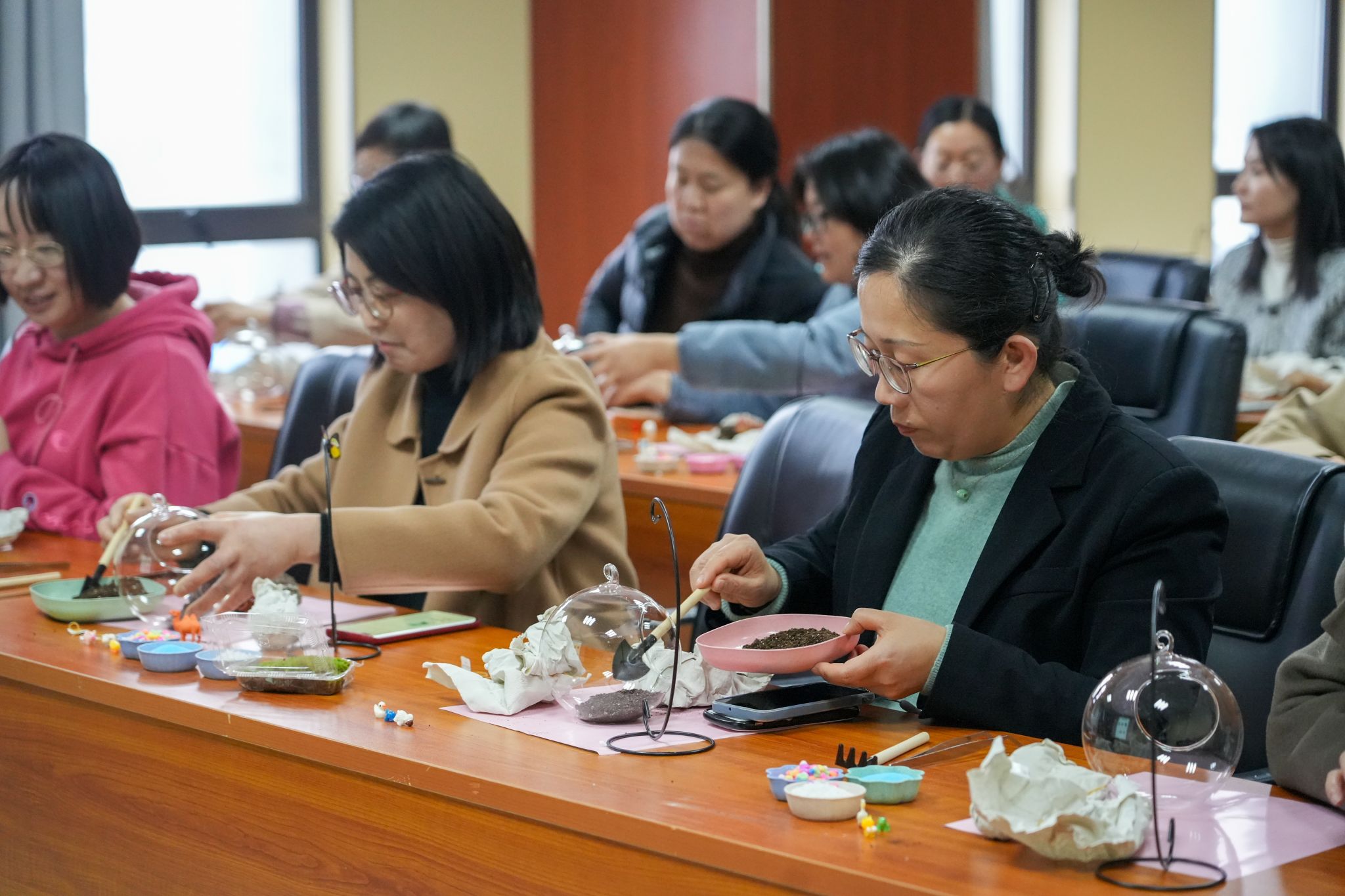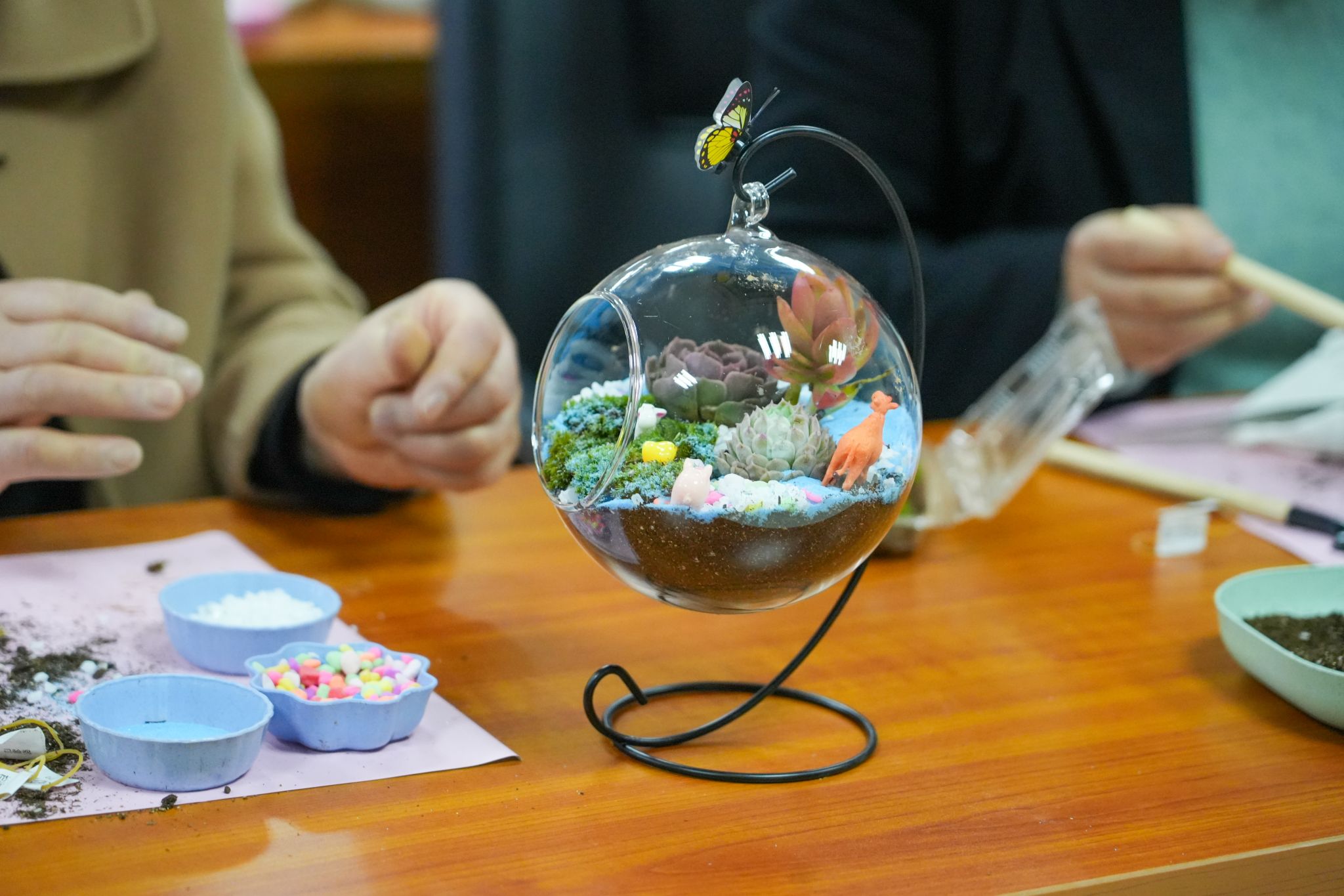 一花一世界,一景一天地。活动现场,参与者们在微景观艺术导师的精心指导下,用巧手将绿植、小石块、细沙、和苔藓等自然元素娴熟地搭配起来。她们动作细致,从准备土壤、种植植物、铺设石径到点缀装饰,每一位女职工都成为了能工巧匠,挥洒着无尽的创意,打造出一个个布满春意、色彩缤纷的生态小角落。在繁忙的工作中,她们寻得了片刻的宁静与温情,相聚在这个充满浪漫气息的时刻,播撒春天的种子,孕育出一份份美丽。本次聚会在一片和谐而温馨的氛围中落下了帷幕。