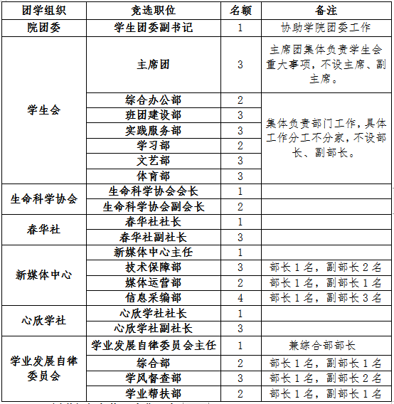 员工会设主席团成员3名,工作部门成员16名;生命科学协会设会长1名,副会长2名;春华社设社长1名,副社长3名;新媒体中心设主任1名,部长团9名;心欣学社社长1名,副社长3名;学业发展自律委员会设主任1名,部长团7名。此次竞选,员工会主席团面向公司2020级本科生,新媒体中心主任面向2020级本科生,其余职位面向2021级全体本科生。鼓励符合条件的、未在团学组织工作过的同学积极参加本次换届竞选。