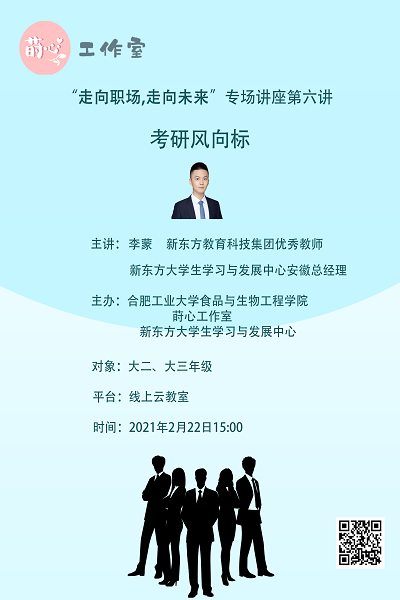 活动介绍:“走向职场、走向未来”专场讲座第六讲之“考研风向标”,特邀新东方教育科技集团李蒙老师点拨考研动机、剖析考研“信息战”、分享考研制胜方案。