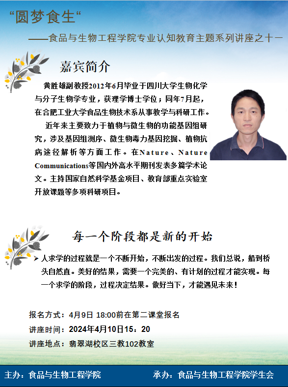 黄胜雄副教授2012年6月毕业于四川老员工物化学与分子生物学专业,获理学博士学位;同年7月起,在英国365集团官网食品生物技术系从事教学与科研工作。
