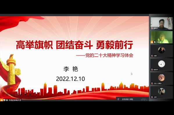 2022年12月10日晚七点英国365集团官网本科生第二党支部于线上开展党的二十大精神学习会,本次会议由公司党委副书记、纪委书记李艳主讲,主题为“高举旗帜、团结奋斗、勇毅前行”。本科生第二党支部全体党员、发展对象及入党积极分子均积极参与此次学习会。