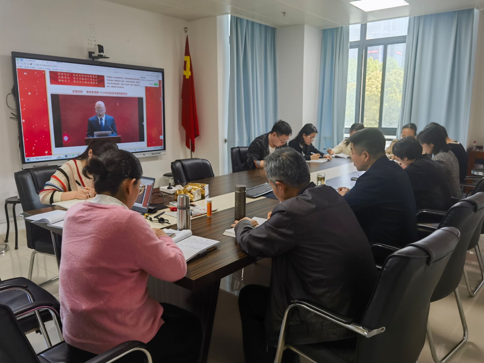 4月18日机关党支部集中学习习近平总书记关于弘扬教育家精神的重要指示,党支部书记李金凤主持会议,支部全体党员参加学习。
