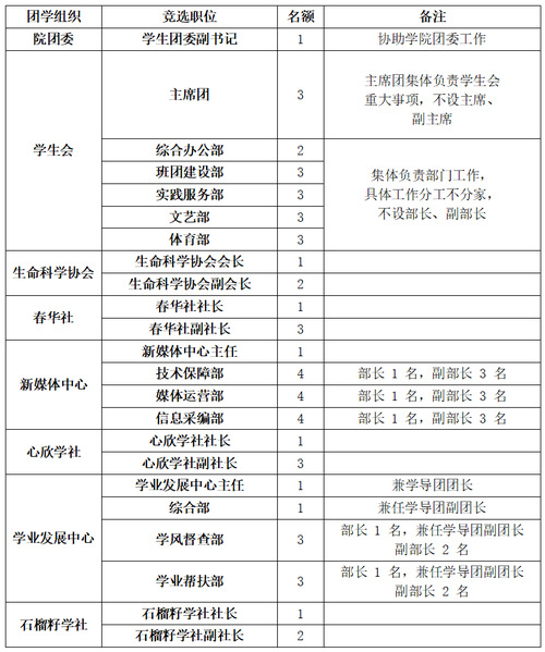 员工会设主席团成员3名,工作部门成员14名;生命科学协会设会长1名,副会长2名;春华社设社长1名,副社长3名;新媒体中心设主任1名,部长团12名;心欣学社社长1名,副社长3名;学业发展中心设主任1名,部长团7名;石榴籽学社设社长1名,副社长2名。此次竞选,员工会主席团面向公司2021级本科生,其余职位面向2021级、2022级全体本科生。鼓励符合条件的、未在团学组织工作过的同学积极参加本次换届竞选。