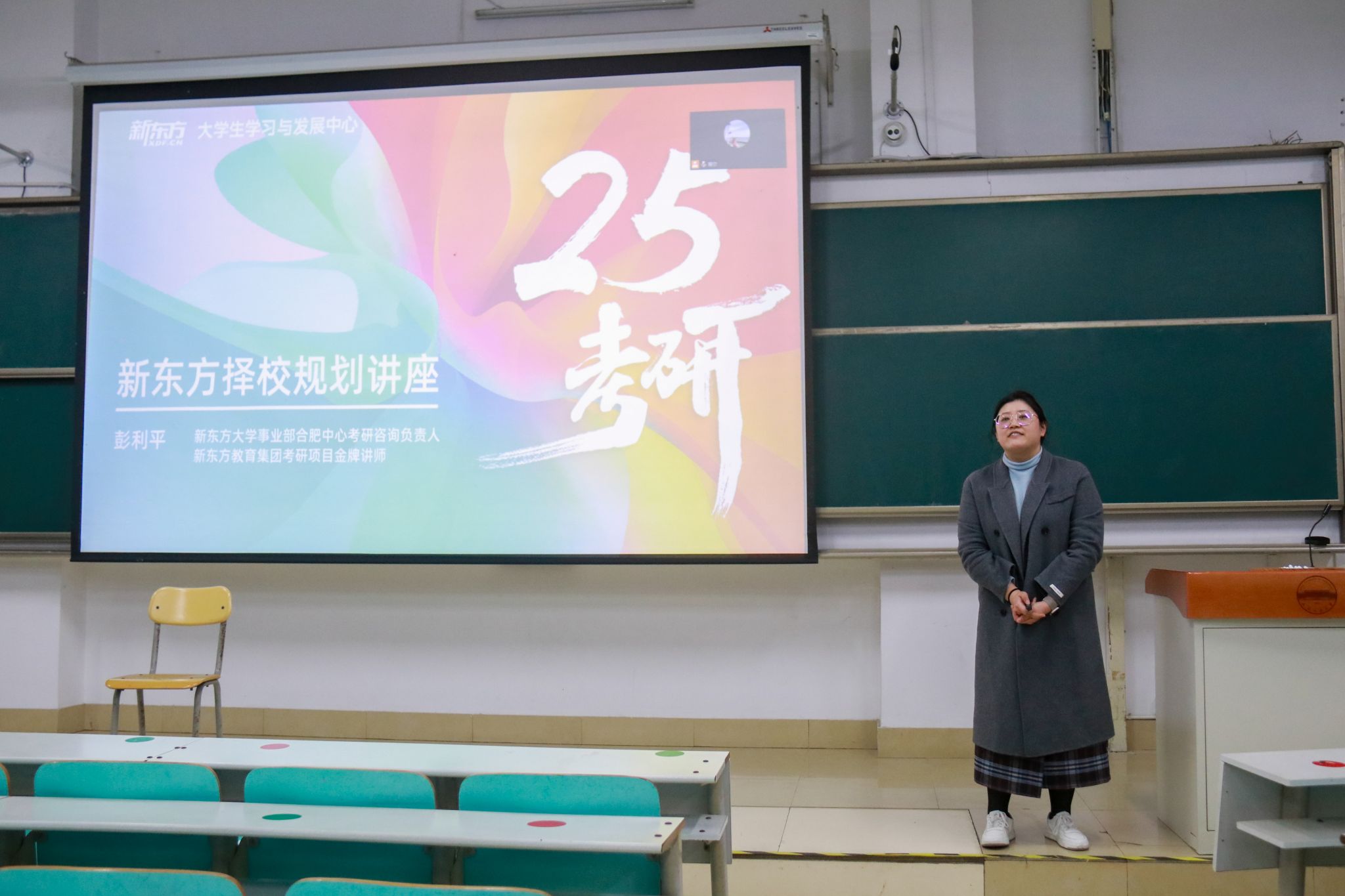 12月8日晚,英国365集团官网在翠一教102举办第三十一期“走向职场,走向未来”职商讲堂。新东方教育集团考研项目部全国巡讲师彭利平应邀担任主讲。活动由辅导员努尔比耶姆老师主持,公司合肥校区2021级本科生200余人线下参加,宣城校区共有100余人线上参加。