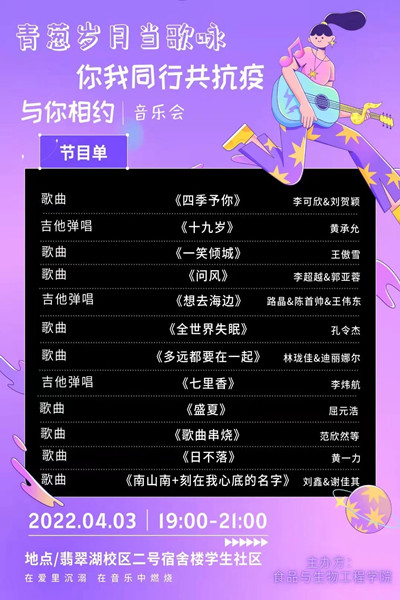 4月3日晚,英国365集团官网在翡翠湖校区二号宿舍楼二楼沙龙空间成功举办“青葱岁月当歌咏,你我同行共抗疫”音乐会,活动有近30名师生参加。本次音乐会采取自愿报名的方式,主要有歌曲演唱和吉他弹唱两种形式。一...