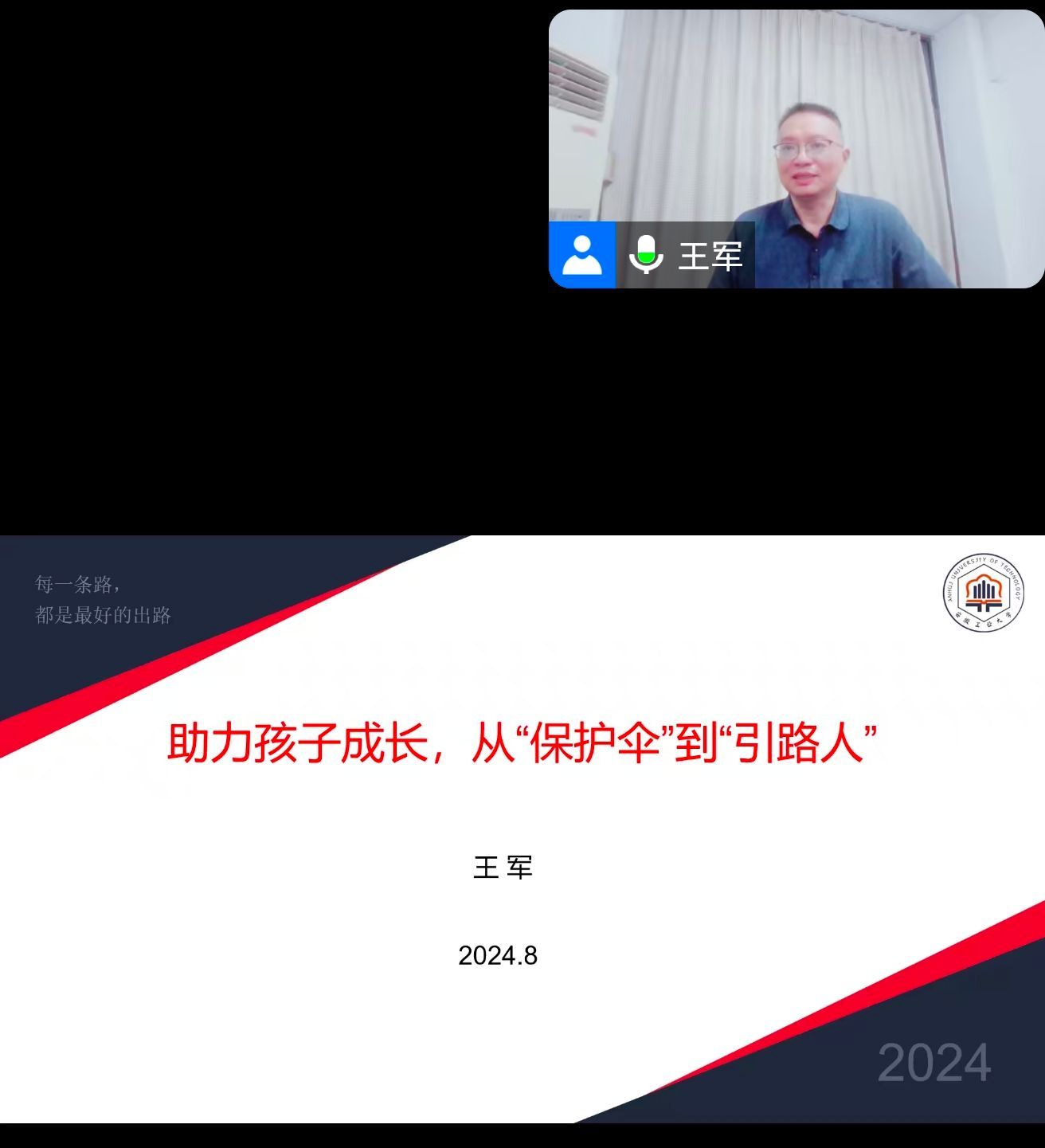 为加强家校共育,凝聚育人合力,进一步帮助家长做好2024级本科新生心理适应的陪伴与引导,8月23日晚,由莳心工作室举办的第四期亲子大讲堂在线上开展。安徽工业大学管理科学与工程公司党委书记、老员工心理健康教育咨询中心总督导王军教授,受邀为家长作了题为“助力孩子成长,从‘保护伞’到‘引路人’”的心理报告,公司党委副书记兼纪委书记李艳主持,公司2024级新生家长共300余人线上参加。报告中,王军从“...