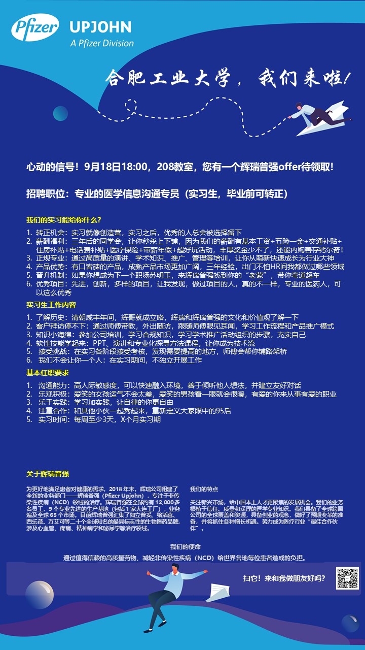 用人单位:辉瑞普强举办时间:2019年9月18日18:00举办地点:食品生物大楼208会议室公司介绍: 作为一家承诺于患者为先的企业,辉瑞始终都在积极变革以满足那些需要我们的人群不断变化的需...