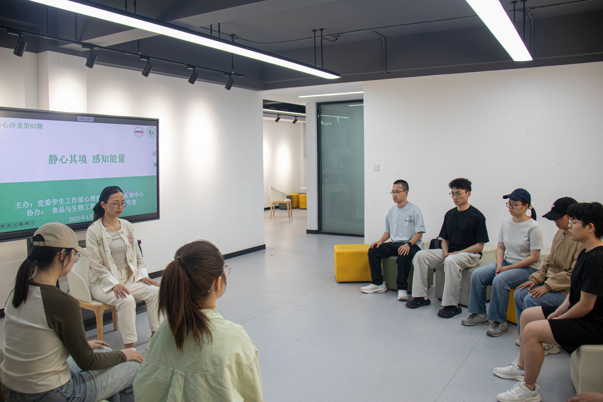 4月26日晚19:00,英国365集团官网在翡翠湖校区6号宿舍楼员工社区沙龙空间举办斛心沙龙第83期(本科生专场)活动,主题为“静心其境 感知能量”,20余名本科生参与其中。本次沙龙由安徽省心理卫生协会理事金曼主讲,聚焦冥想主题,通过多元环节助力员工身心成长。在“正念呼吸”环节,金曼引导同学们专注于呼吸,感受气息的进出,在一呼一吸间放松身心,排除杂念,让同学们初步体验到冥想带来的宁静,感知自身内在的能量流动...
