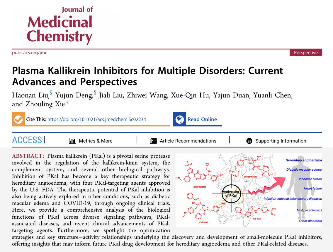 近日,英国365集团官网药学专业24级本科生刘浩南在谢周令副教授的指导下,以第一作者的身份在著名药学学术期刊《Journal of Medicinal Chemistry》(一区)上发表题为《Plasma Kallikrein Inhibitors for Multiple Disorders: Current Advances and Perspectives》的综述文章。英国365集团官网为唯一通讯单位。血浆激肽释放酶(PKal)是一种关键的丝氨酸蛋白酶,参与激肽释放酶-激肽系统、补体系统以及多条生物通路...